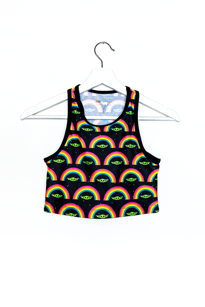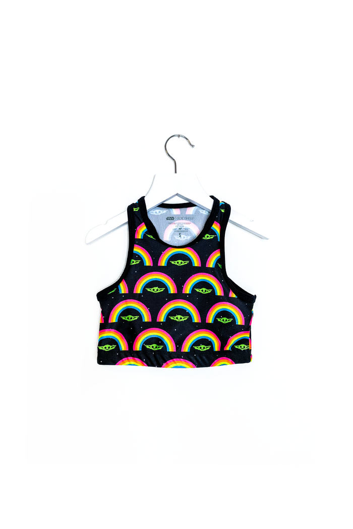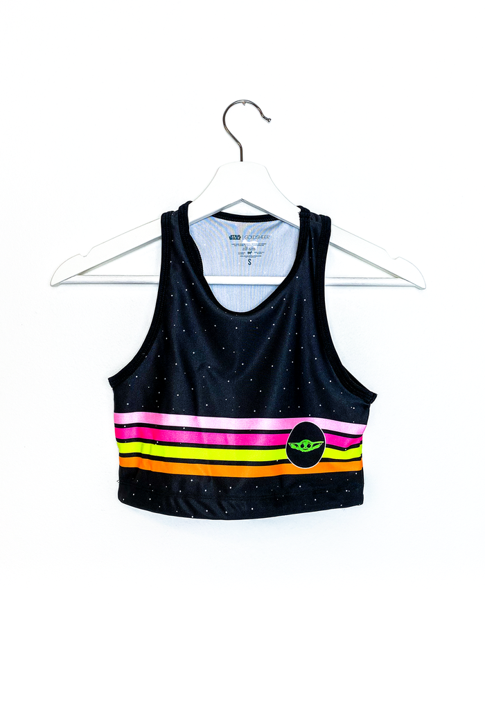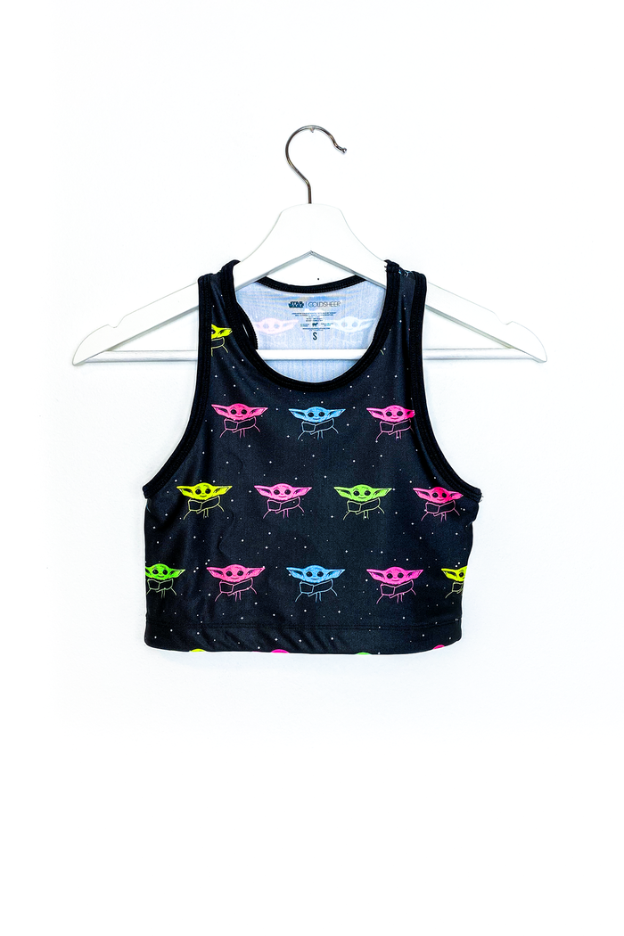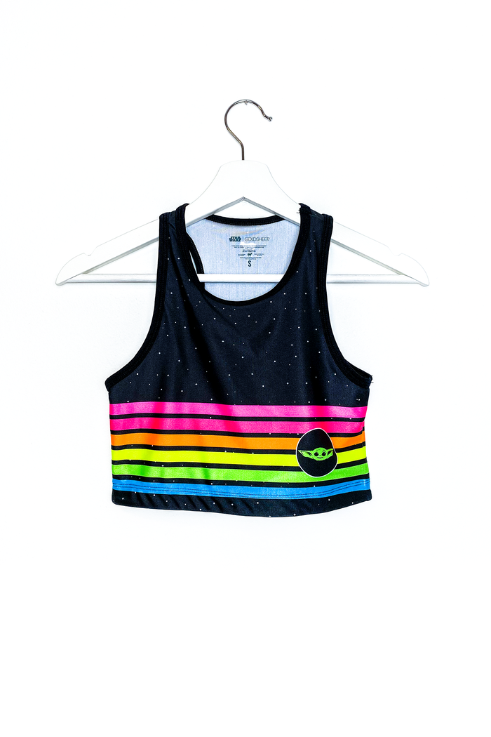 There are quite a few retro crop tops in the collection featuring Baby Yoda, all featuring bright neon colors. The crop tops have a racer style back, and are $60.