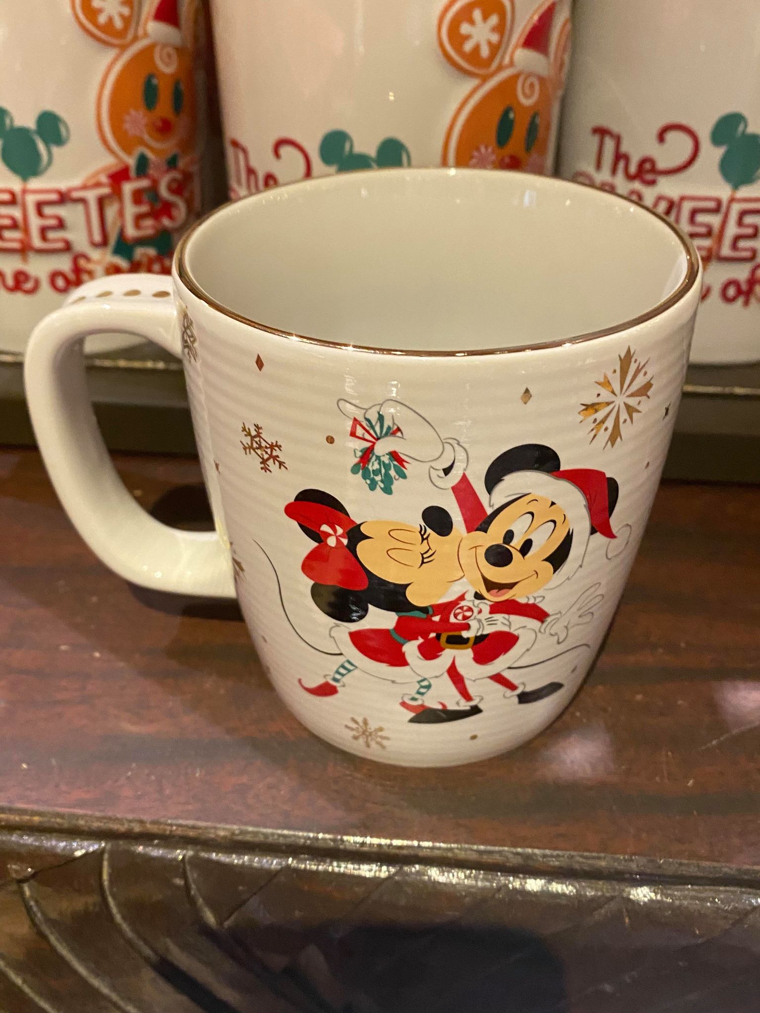 We found a cute Christmas mug featuring Mickey and Minnie kissing under the mistletoe! The back of the mug says “Meet me under the Mistletoe”.
