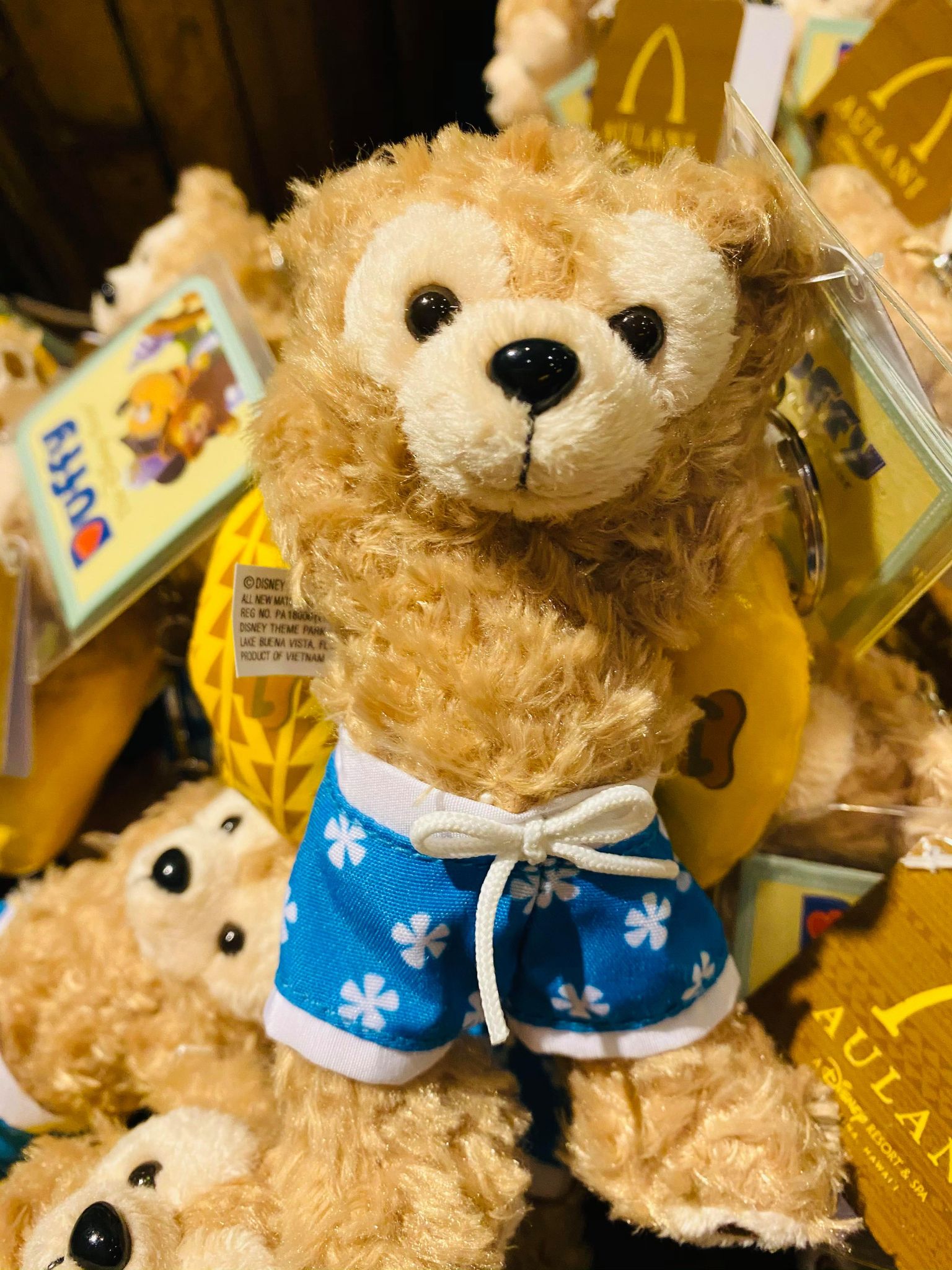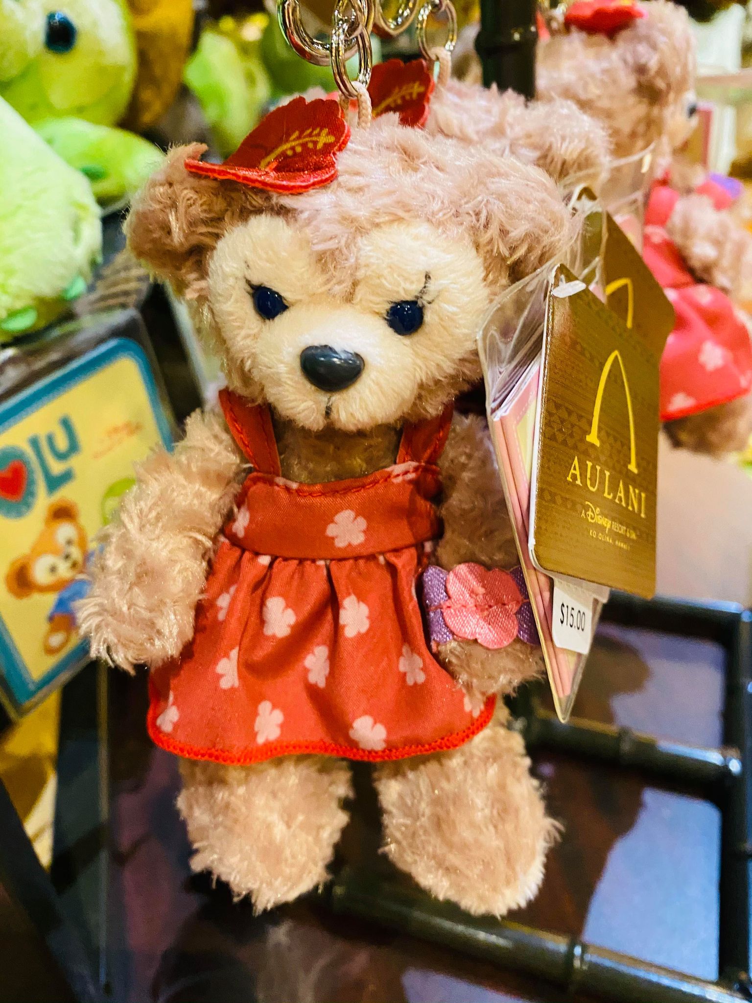 We found Duffy and Shellie May plush keychains, and they are so adorable. They’re wearing their finest Hawaiian outfits to visit Aulani!