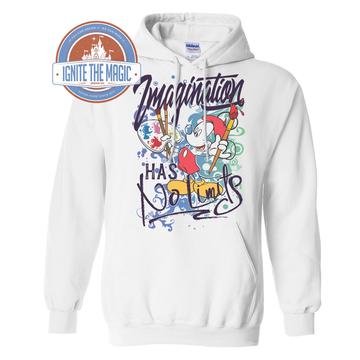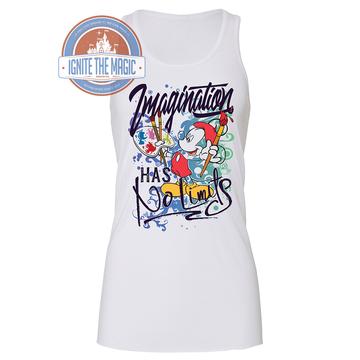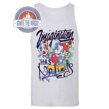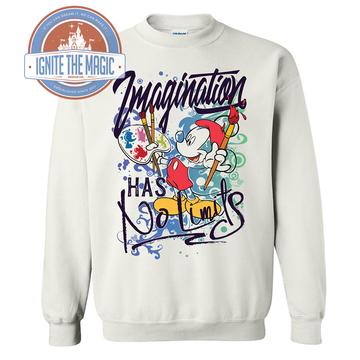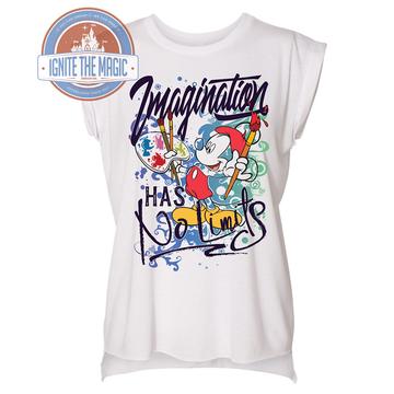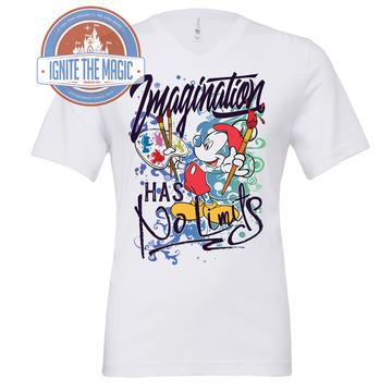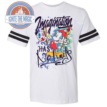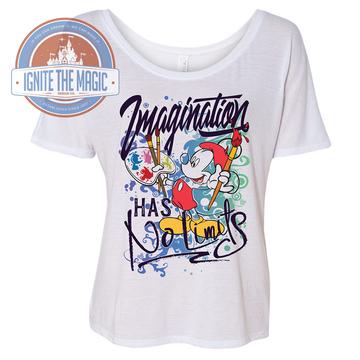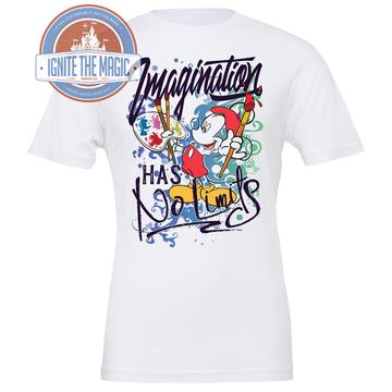 The shirt features the phrase “Imagination Has No Limits” and has Mickey holding a paint palette and paintbrush. He’s also wearing a cute little beret, so I guess we are to assume he’s being super creative in Europe, right?