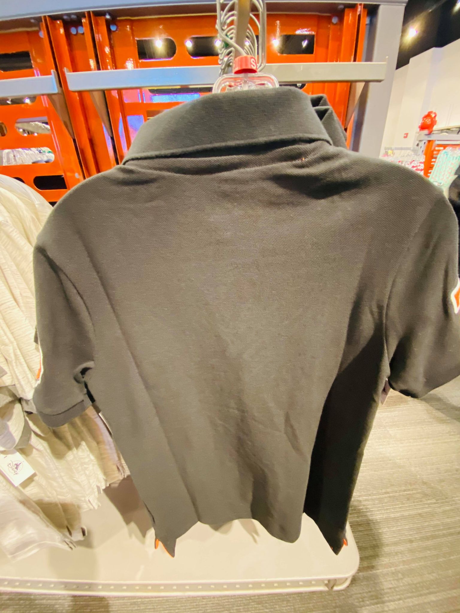 The next polo shirt we have is a grey shirt with white and orange embroidered Walt Disney World designs on the chest and sleeves.