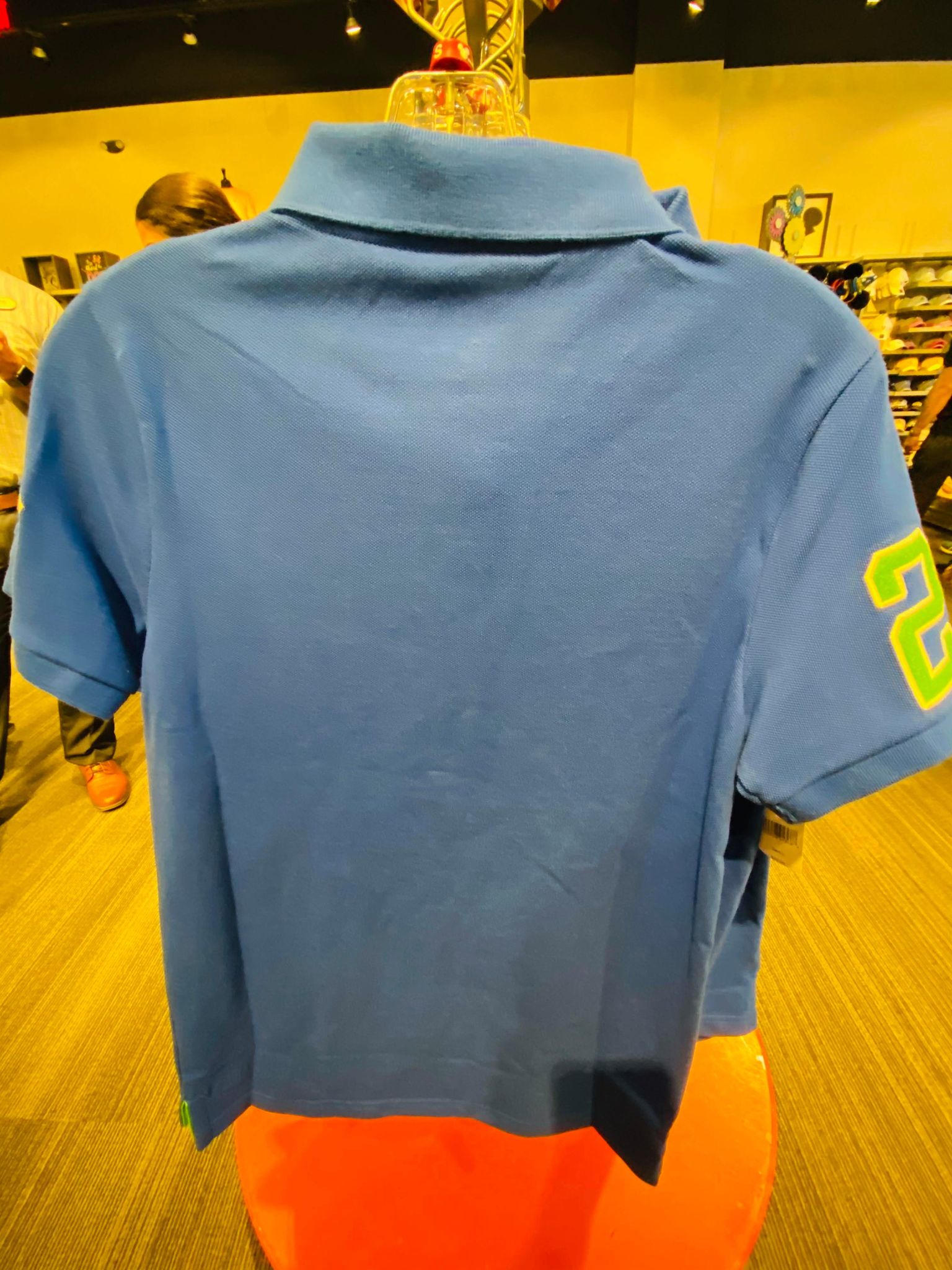 This design features a blue polo shirt with lime green and yellow embroidered details.